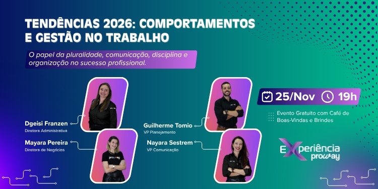 O Experiência ProWay é uma série de eventos gratuitos que unem comportamento, tecnologia e desenvolvimento profissional — sempre com a proposta de promover aprendizado e troca entre especialistas e o público.
